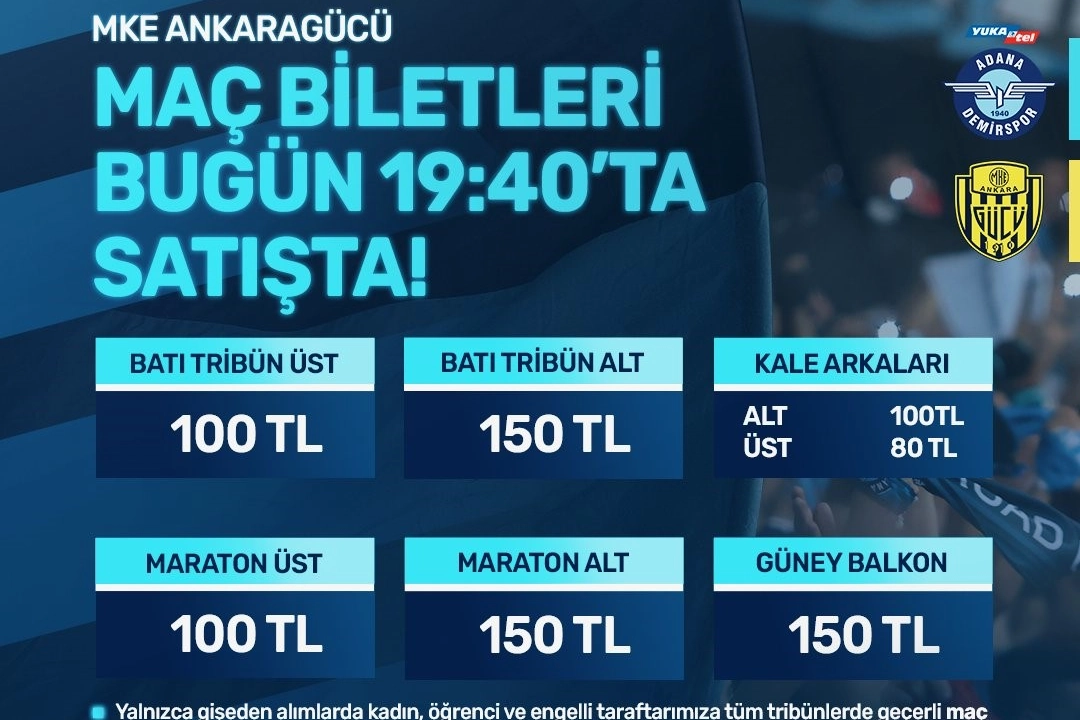 Mavi-lacivertli kulüpten yapılan açıklamada, “Yeni Adana Stadyumu'nda 20 Ocak Cumartesi günü saat 19.00'da karşılaşacağımız MKE Ankaragücü maçının biletleri bugün saat 19.40'ta satışta. Yalnızca gişeden alımlarda geçerli olmak üzere, kadın, öğrenci ve engelli taraftarımıza tüm tribünlerde maç biletleri 50 TL olacaktır. Bilet satışları kademeli olacaktır, alt tribünlerde bilet tükenmesi durumunda üst tribünler de satışa açılacaktır” denildi.