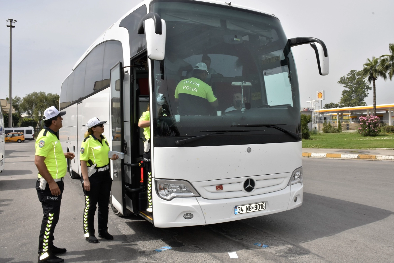 Adana Merkez Otogar'da trafik birimleri, otobüs şoförlerine yönelik lastik, takograf ve alkol denetimi yaptı. Denetimler kapsamında otobüslerin lastiklerinin yol güvenliğine uygun olup olmadığı, şoförlerin sürüş ve dinlenme sürelerini kaydeden takograflar denetlendi. Otobüs şoförlerinin alkollü olup olmadıkları test edildi.