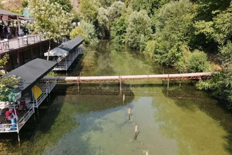 Sıcaklığın 30 derecenin altına düştüğü bölgeye gelenler, su üzerine kurulu çardaklarda, masalarda yemeklerinin tadını çıkarırken, aynı zamanda Dim Çayı'nın 4 derecelik suyunda serinleyebiliyor.