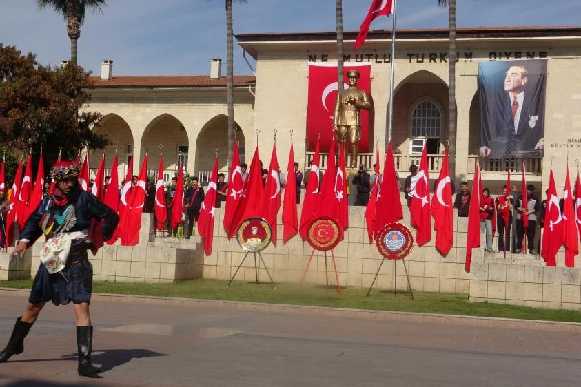 Mersin Tren Garı’nda başlayan ve Cumhuriyet Meydanı'nda devam eden kutlama programında ilk önce gazileri taşıyan temsili tren geldi. Temsili treni karşılayan Vali Ali Hamza Pehlivan, gazilerin takdim ettiği Türk bayrağını öperek teslim aldı. Tören, bando eşliğinde Vali Pehlivan, protokol üyeleri, gaziler, öğrenciler ve vatandaşlardan oluşan kortejin Cumhuriyet Meydanı'na yürümesiyle devam etti. Daha sonra Atatürk Anıtı'na Vali Pehlivan, Akdeniz Bölge ve Garnizon Komutanı Tuğamiral Murat Fırat ile Mersin Büyükşehir Belediye Başkanı Vahap Seçer tarafından çelenk sunuldu. Çelenk sunumlarının ardından öğrenciler şiir okudu, belediye halk oyunları ekibi ise gösterilerini sundu.
