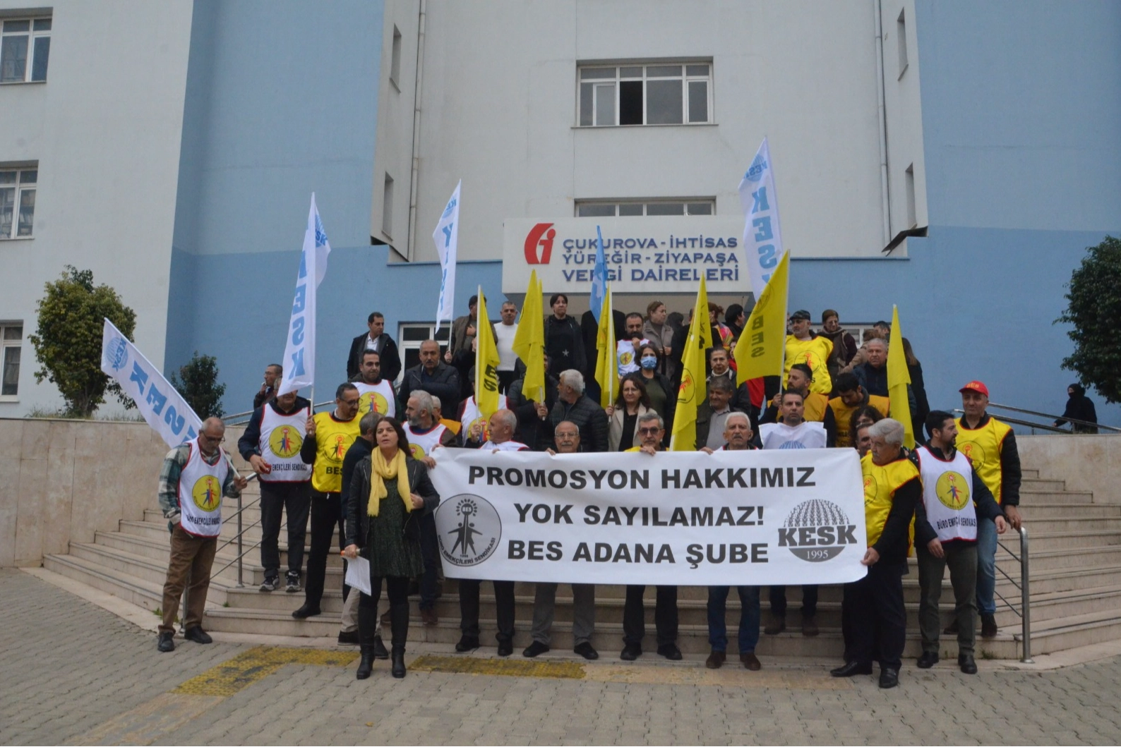 BES Adana Şubesi üyeleri promosyonlarla ilgili Çukurova Vergi Dairesi önünde basın açıklaması gerçekleştirdi. Açıklamayı BES Adana Şube Başkanı Fatma Güney Sarıoğuz yaptı. Güney, Adana Vergi Dairesi Başkanlığı çalışanları olarak yeni bir banka sözleşmesi imzalanmasının eşiğinde olduklarını söyledi. Mevcut sözleşmelerinin 3 yıllık olduğunu ve bu ay içerisinde son bulacağını belirten Güney, "Geçtiğimiz aylarda birtakım görüşmeler yapılmış, promosyon ödemesi için verilen en yüksek teklif üç yıllık dönem için 15.600 TL olmuştur" dedi.