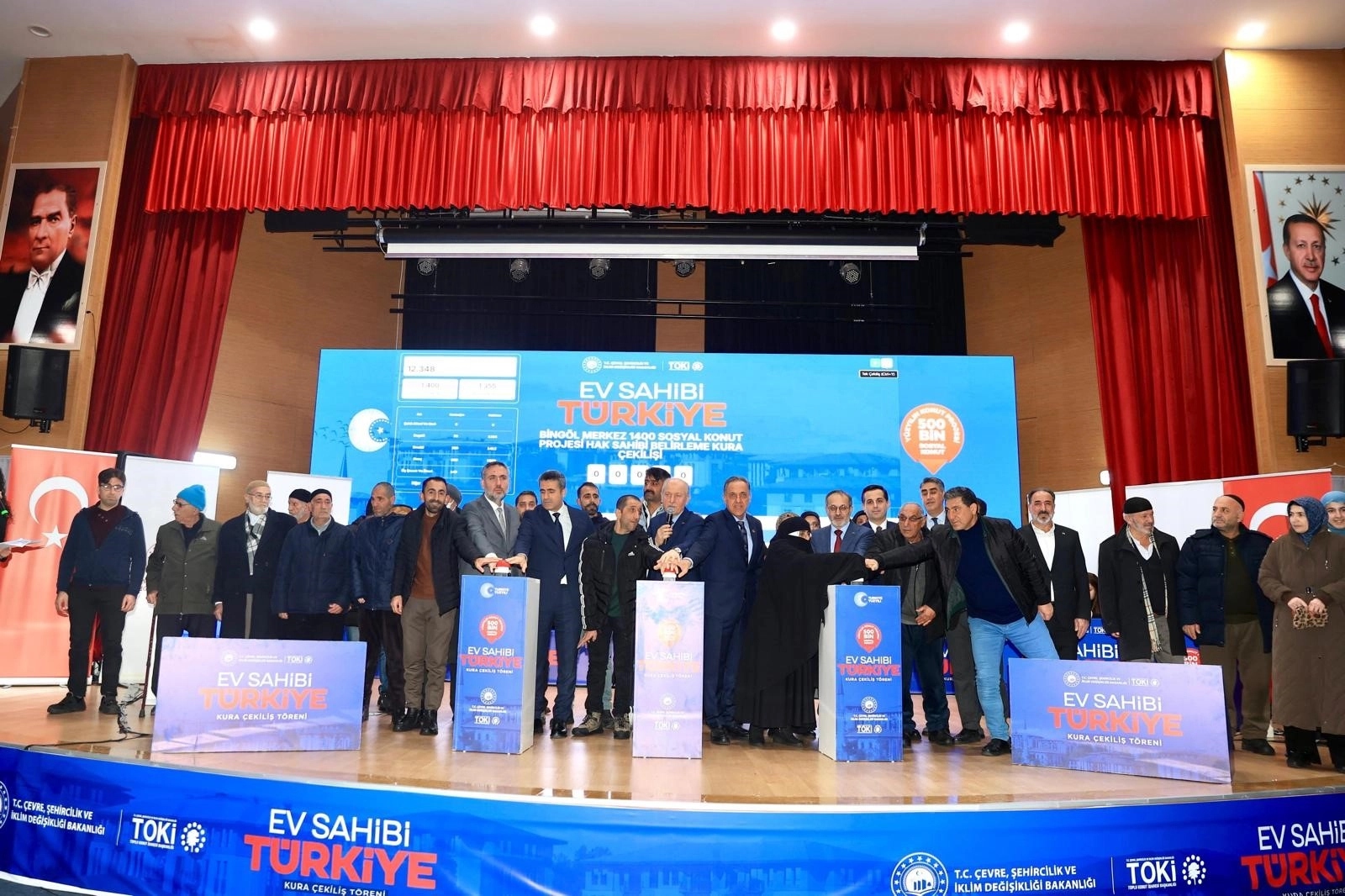 7 İLÇEDE HAK SAHİPLERİ BELİRLENDİKonuşmaların tamamlanmasının ardından protokol üyeleri sahneye çıkarak kura butonuna bastı. Yapılan çekilişle Bingöl merkez başta olmak üzere Adaklı Genç Karlıova Kiğı Solhan ve Yayladere ilçelerinde inşa edilecek toplam 2 bin 59 sosyal konutun hak sahipleri resmen belirlenmiş oldu.