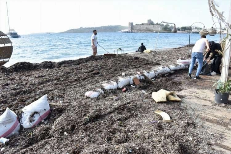 Muğla'nın Bodrum ilçesinde, sahil kesimindeki esnaf, kuvvetli rüzgar nedeniyle kıyıya sürüklenen yosun ve atıkların temizlenmesi için çalışma başlattı.