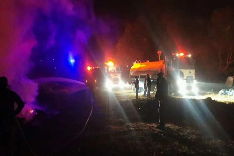 İtfaiye ekiplerinin ve iş makinelerinin müdahalesiyle söndürülen alevler, yaklaşık 12 ton saman balyası ve 2 traktör römorkunun yanmasına neden oldu.