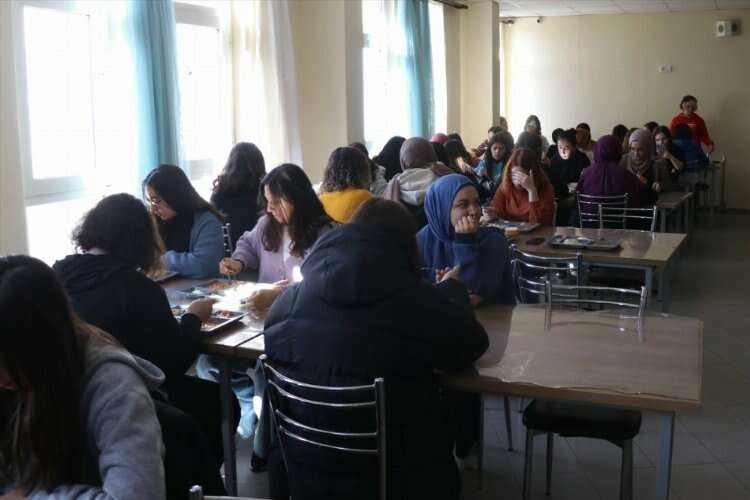 Kılınç, yemeklerle kız öğrencilerin 2 bin, erkek öğrencilerin de 2 bin 500 seviyesinde günlük kalori ihtiyaçlarını aldıklarını vurgulayarak, "Beslenmede karbonhidrat, protein, meyve ve sebze gibi dağılımlara dikkat ediyoruz. Sabahları en az sekiz çeşit kahvaltı, öğle ve akşam yemeği de en az dört, ara öğünde ise en az iki çeşit yemeği öğrencilerimize sunuyoruz." dedi.