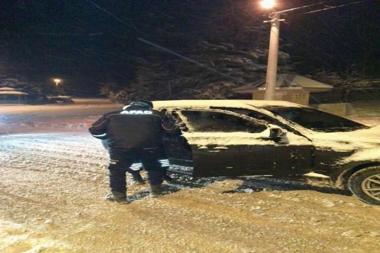 Hafta sonu kayak için merkeze giden ve akşam saatlerinde dönüşe geçen bazı tatilciler, etkisi artıran kar yağışından dolayı yol kapanınca araçlarında mahsur kaldı.