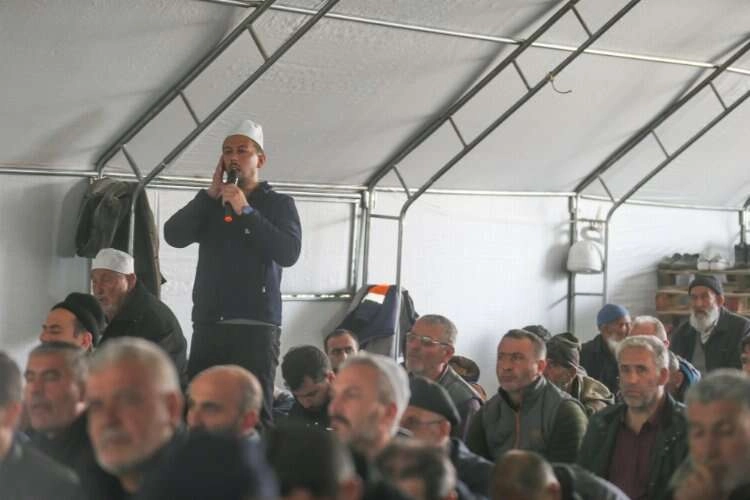 İlçe Müftüsü Hasan Akman'ın depremlerin ardından yardım faaliyeti gerçekleştirdiği sırada kayarak düştüğünü ve ayağının kırıldığını anlatan Özkişi, "Camilerimizin kullanılamaz durumda olması nedeniyle mescit ihtiyacı oluştu. Yesevi Hareketi bu ihtiyacı karşılamayı üstlenmiş, Allah razı olsun. Cuma namazı öncesi mescidimizi dizayn ettik ve ilçe halkının hizmetine açtık. İlgilenen ve emeği geçen herkese teşekkür ediyorum. Allah razı olsun, Allah bu felaketi bir daha yaşatmasın." ifadelerini kullandı.