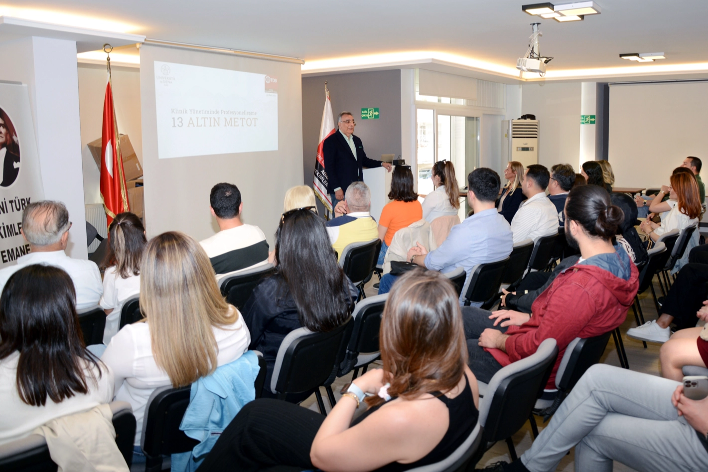 Başkan Dt. Güler’in konuşmasının ardından ‘Klinik Yönetiminde 13 Altın Metot’ konulu başlığıyla seminer vererek deneyimlerini paylaşan Dr. Kübel İltan Özkut, diş hekimliği mesleğinde Liderlik, Stratejik Planlama, Finansal Beceriler, Kliniğin Efektifliği ve Ergonomisi, İK ve Ekip Çalışması, Organizasyonel Toplantılar, Yönetimsel Toplantılar, İletişim Becerileri, Dokümantasyonlar, Veri Analizleri, Yeni Hasta Deneyimleri, Etkin Zarar Planlaması ve Rutin Hasta Takibi gibi metotların altın değerinde olduğunu belirterek uygulanması halinde kliniklerde başarının kendiliğinden geleceğini söyledi.