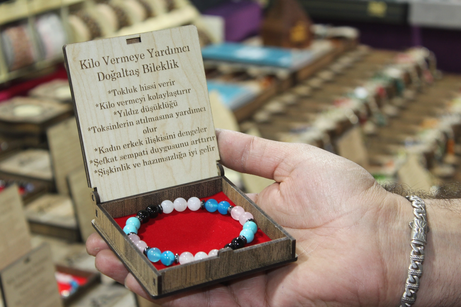 “Standa en fazla kilo verdiren bileklik ilgi görüyor”Abdurrahman Büyük, "Geçen yıl da Tesbih ve Doğal Taşlar Fuarı'na katıldık. Hafta sonu ile fuara gelen kişi sayısında önemli bir artış gözlemliyoruz. Standımızda en fazla ilgi gören ürünlerden biri kilo verdiren bileklik. Bunun yanı sıra başarı bilekliği ve kehribar da hızlı satılan ürünler arasında yer alıyor" diye ifade etti.