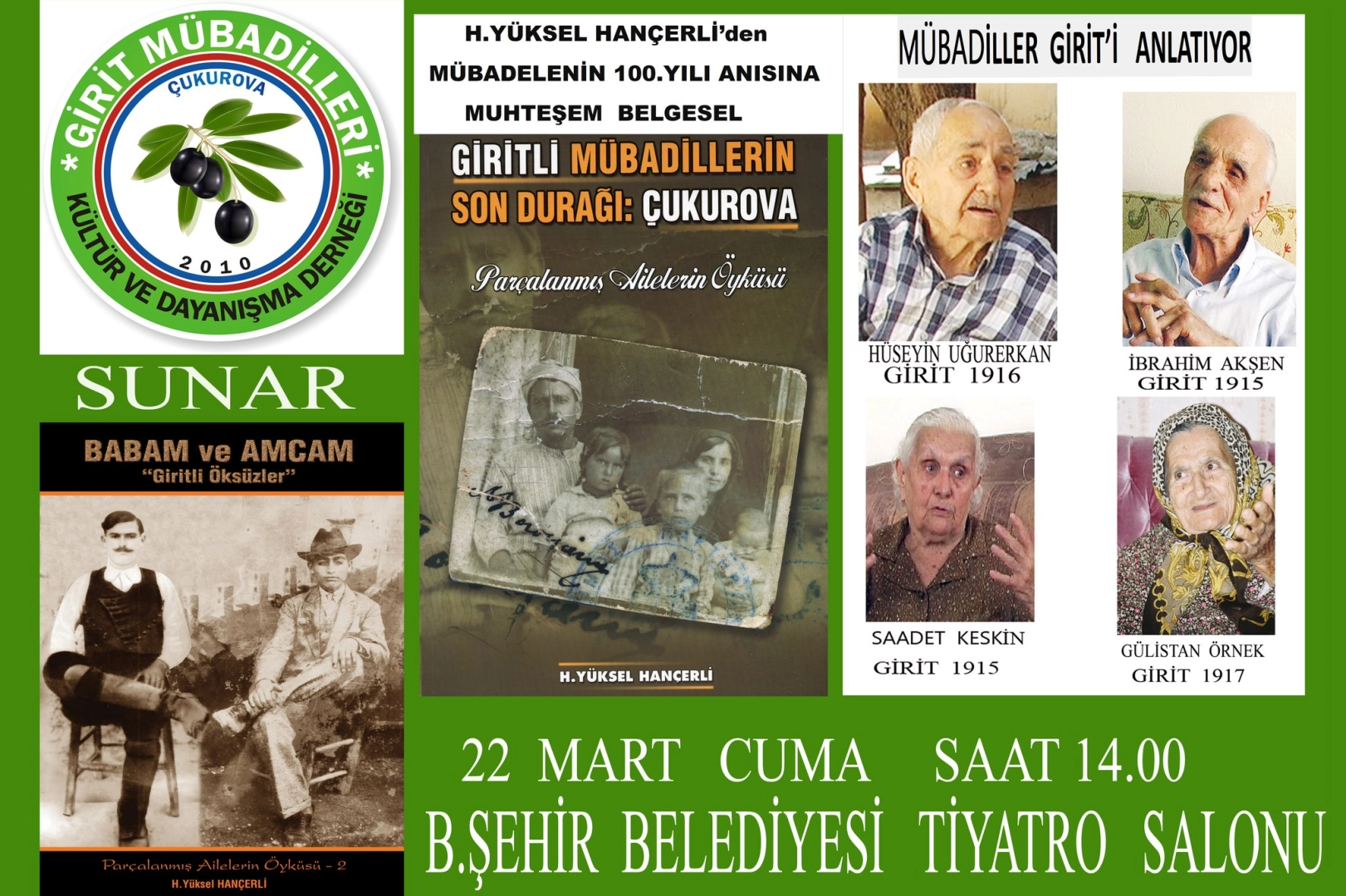 Çukurova Gazeteciler Cemiyeti üyesi, TRT Çukurova Bölge Haber Müdürlüğü’nden emekli, Kameraman Yüksel Hançerli’nin Lozan Mübadelenin 100.yılı anısına hazırladığı Girit Mübadilleri Belgeseli, izlenime sunulacak.