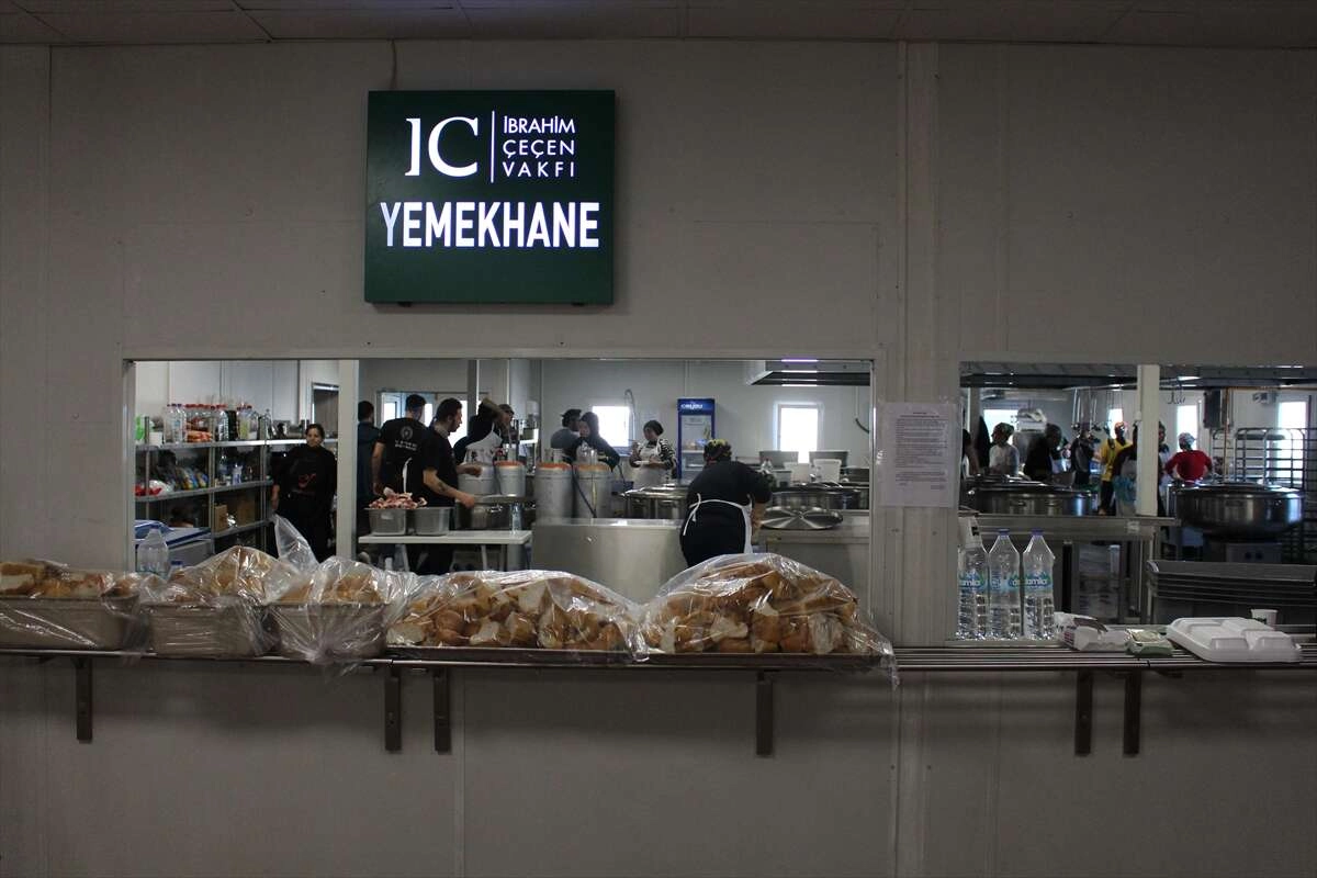 Kahramanmaraş merkezli 6 Şubat'taki depremlerin yıl dönümü kapsamında Sakarya Mahallesi'ndeki İbrahim Çeçen Konteyner Kenti yemekhanesinde, 120 gönüllünün katılımı ve hayırseverlerden gelen 100 adaklık koyunla yemek yapıldı.