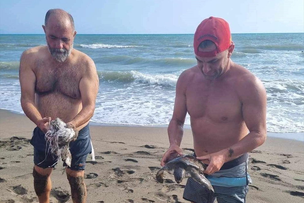 Hatay'ın Samandağ ilçesinde denizde çuvala takılan caretta caretta yavrusu, itfaiye ekiplerince kurtarıldı.