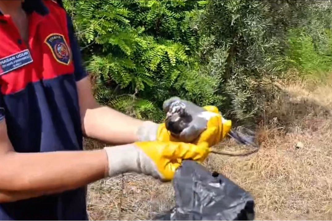 Hatay’ın İskenderun ilçesi Kocatepe Mahallesi'nde ayağına poşet dolanarak ağaca takılıp mahsur kalan bir kuş, itfaiye ekiplerinin çalışmasıyla kurtarıldı.