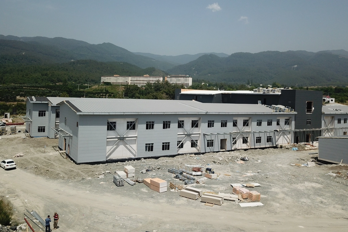 Kahramanmaraş merkezli 6 Şubat 2023'teki depremlerden etkilenen Hatay'ın Erzin ilçesinde yapımı devam eden 100 yataklı acil durum hastanesinde ağustosta hasta kabulüne başlanması öngörülüyor.