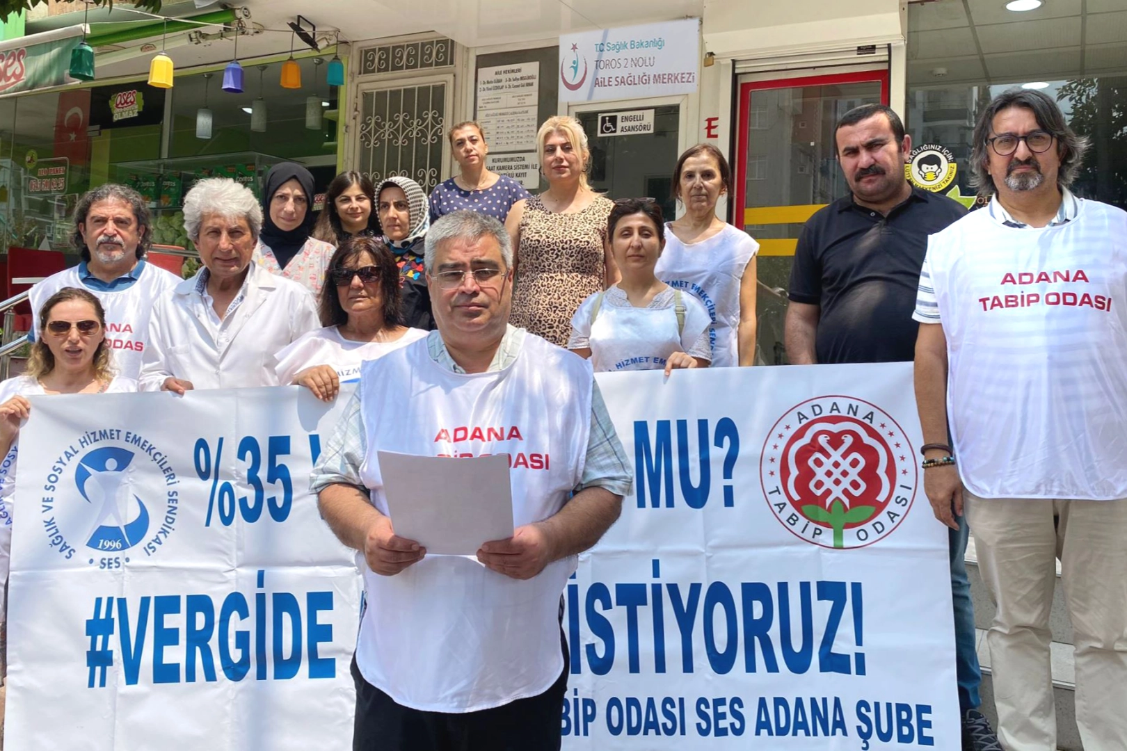 Adana Tabip Odası (ATO) ile Sağlık ve Sosyal Hizmet Emekçileri Sendikası'nın (SES) Adana’da birlikte yürüttüğü "Vergide Adalet İstiyoruz" eylemi de, bu hafta Toros 2 Aile Sağlığı Merkezi önünde gerçekleşti.