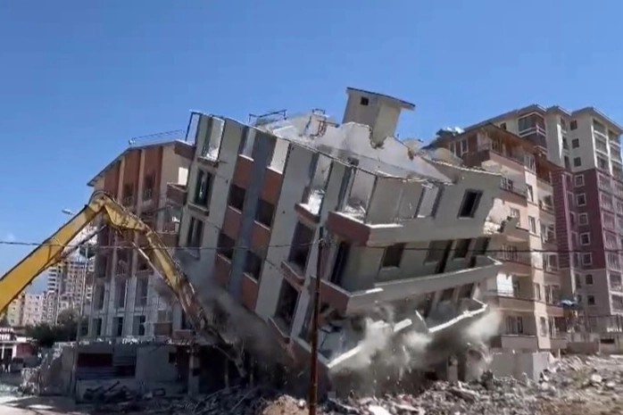 Kahramanmaraş merkezli depremlerde ağır hasar alan Hatay’da mahkeme süreci sona eren binaların yıkım ve enkaz kaldırma çalışmaları aralıksız sürüyor. Antakya ilçesi Ekinci Mahallesi’nde bulunan 6 katlı apartman da iş makinesiyle kontrollü olarak yıkıldı. Binanın kağıt gibi yerle bir olma anı ise saniye saniye kameralara yansıdı. 6 katlı binanın yıkımı esnasında herhangi bir olumsuzluk yaşanmadı.