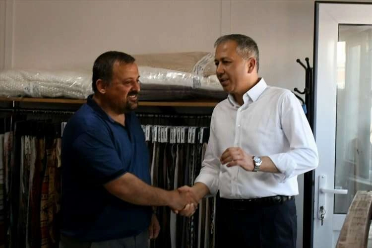 Bakan Yerlikaya, açıklamasının ardından prefabrik iş yerlerine gitti, sohbet ettiği esnafın taleplerini dinledi.