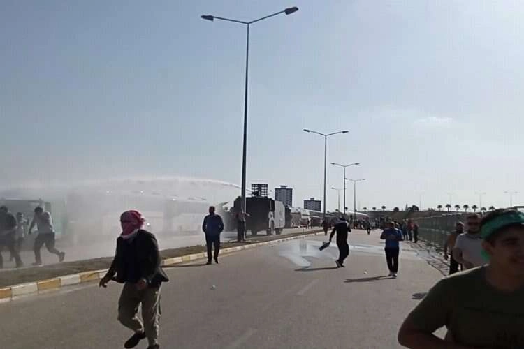 Polis gruba İncirlik Üssü’nün arka tarafındaki Sezai Karakoç Bulvarında eylem yapmaları için yer gösterdi. Alan da demir bariyerlerle çevrildi. Ancak bir grup, polisin bariyerlerini aşıp tarladan üsse girmeye çalıştı. Bunun üzerine polis gruba su sıkarak müdahale etti. Polis, grubu askeri bölgeden uzaklaştırdı.