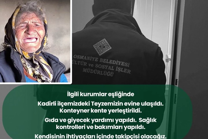 Osmaniye'nin Kadirli ilçesinde, yardıma muhtaç bir teyzemizin durumu ilgili kurumlar tarafından hızlı bir şekilde ele alındı. Ekipler, bölgeye ulaşıp ihtiyaçlarını tespit ettikten sonra, Teyzemiz için konteyner bir ev temin etti. Bu süreçte, gıda ve giyecek yardımları da sağlanarak, yaşlı kadının yaşam koşullarının iyileştirilmesi amaçlandı.