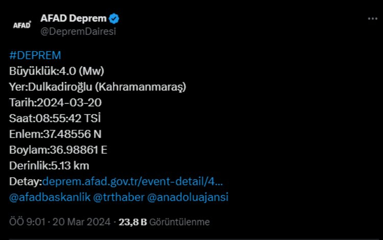 Afet ve Acil Durum Yönetimi Başkanlığı (AFAD), merkez üssü Kahramanmaraş’ın Dulkadiroğlu ilçesi olan bir deprem meydana geldiğini duyurdu.AFAD’ın aktardığına göre, saat 08.55’te yaşanan sarsıntının büyüklüğü 4,0 olarak ölçüldü. Depremin derinliği ise 5.13 kilometre olarak kaydedildi.
