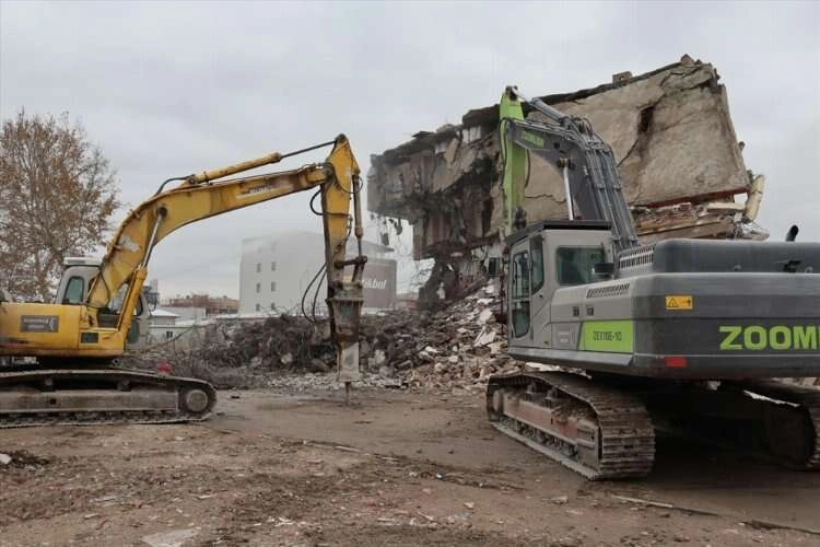Güneşli Mahallesi'ndeki ağır hasarlı bina, iş makineleriyle yıkıldı.