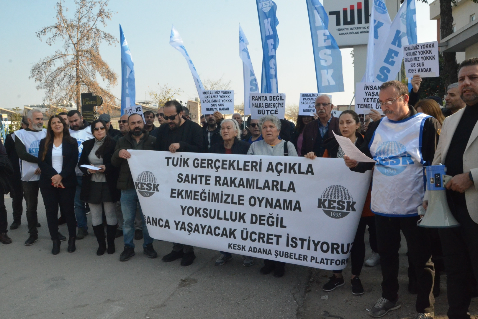 KESK Adana Şubeler Platformu, memur ve emekli maaşları konusunda basın açıklaması yaptı. Adana’da bulunan TÜİK binası önünde açıklama yapan KESK Adana Şubeler Platformu adına basın açıklamasını Erol Eren okudu. Eren, KESK olarak memur ve emekli maaşlarının insanca yaşamaya yetecek yoksulluk sınırının üzerinde olacak şekilde artırılmasını istediklerini söyledi. TÜİK’in gerçekleri yansıtmayan enflasyon rakamlarına göre değil, yoksulluk sınırının üstünde insanca yaşamaya yetecek bir ücret talep ettiklerini aktaran Eren, “Toplumun bütün kesimleri en temel yaşamsal ihtiyaçlarını karşılamakta dahi güçlük çeker hale getirildi. Artık yoksulluk değil, derinleşen yoksulluktan söz eder olduk” dedi.