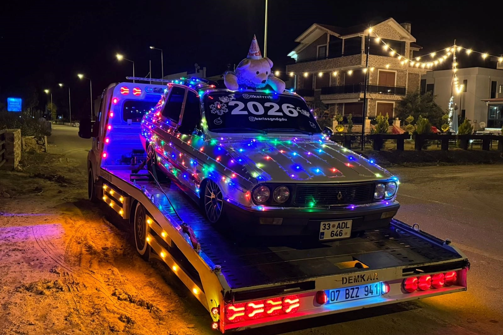 ÇEKİCİ ÜZERİNDE ŞEHİR TURUTrafik güvenliğini tehlikeye atmamak ve yasal mevzuata aykırı davranmamak adına süslenen otomobil trafiğe çıkarılmadı. Işıklandırılan araç, bir çekicinin üzerine yüklenerek ilçe merkezinde gezdirildi.