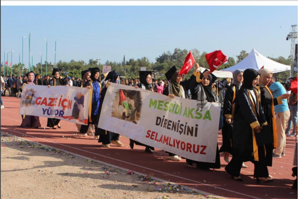 Üniversiteden AçıklamaMersin Üniversitesi'nden yapılan açıklamada, "Sosyal medya hesaplarında ve internet haber sitelerinde dolaşıma sokulan Mersin Üniversitesi mezuniyet töreninde Filistin’e destek pankartının açılmasına engel oldu haberlerine cevabımız videodadır. Mersin Üniversitesi Ailesi, her zaman Filistin Halkının haklı mücadelesinin yanındadır." denildi.