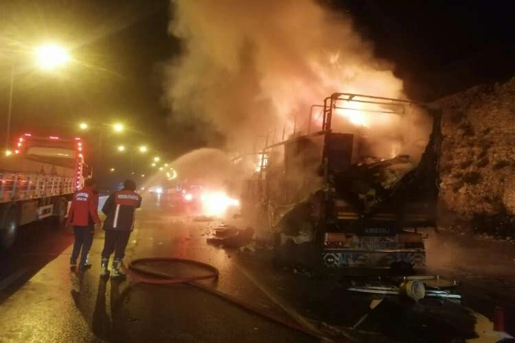 Alınan bilgiye göre, Süleyman Burkankulu'nun kullandığı 15 AAT 927 kupa, 47 AAV 385 dorse plakalı ev eşyası yüklü tır, TEM Otoyolu Karakütük Mahallesi civarında, henüz belirlenemeyen bir nedenle yanmaya başladı.