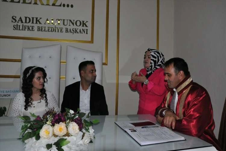 Bir süre sonra evlenme kararı alan işitme engelli çift, Silifke Belediyesinde düzenlenen törende nikah masasına oturdu.