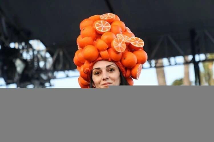 Sahil bandındaki defilede podyuma çıkan mankenler, limon, portakal, mandalina ve greyfurt gibi meyvelerin motifleriyle süslenmiş kıyafetleri tanıttı.
