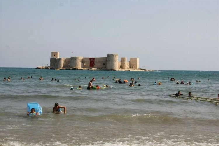 UNESCO Dünya Mirası Geçici Listesi'ndeki Korykos Antik Kenti'nin parçası olan kalenin sahiline gelenler, denizde yüzerek serinliyor.