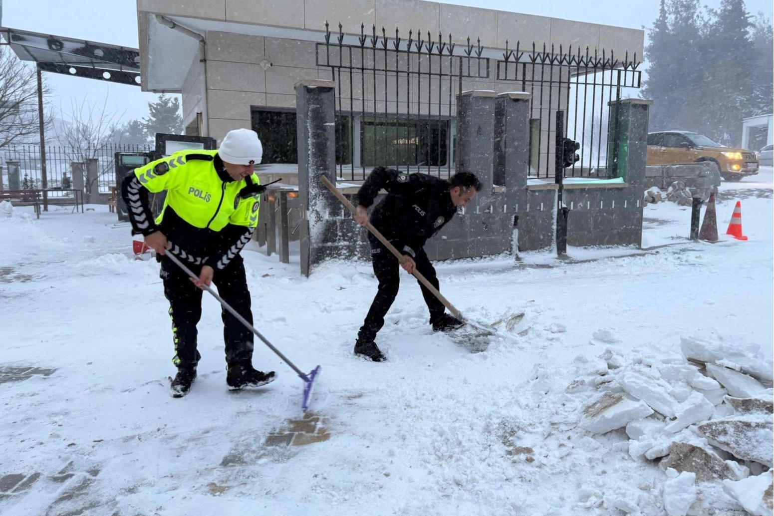 VATANDAŞLARIN GÜVENLİ ULAŞIMI İÇİN HAREKETE GEÇİLDİEmniyet mensupları, ellerine aldıkları kürek ve temizlik ekipmanları ile bina girişinde ve çevresinde biriken kar yığınlarına müdahale etti. Soğuk havaya rağmen yürütülen çalışma neticesinde, buzlanma riski taşıyan alanlar temizlenerek vatandaşların emniyet binasına güvenli bir şekilde giriş çıkış yapabilmesi sağlandı. Personelin kendi imkanlarıyla gerçekleştirdiği bu çalışma, ilçe sakinleri tarafından memnuniyetle karşılandı.