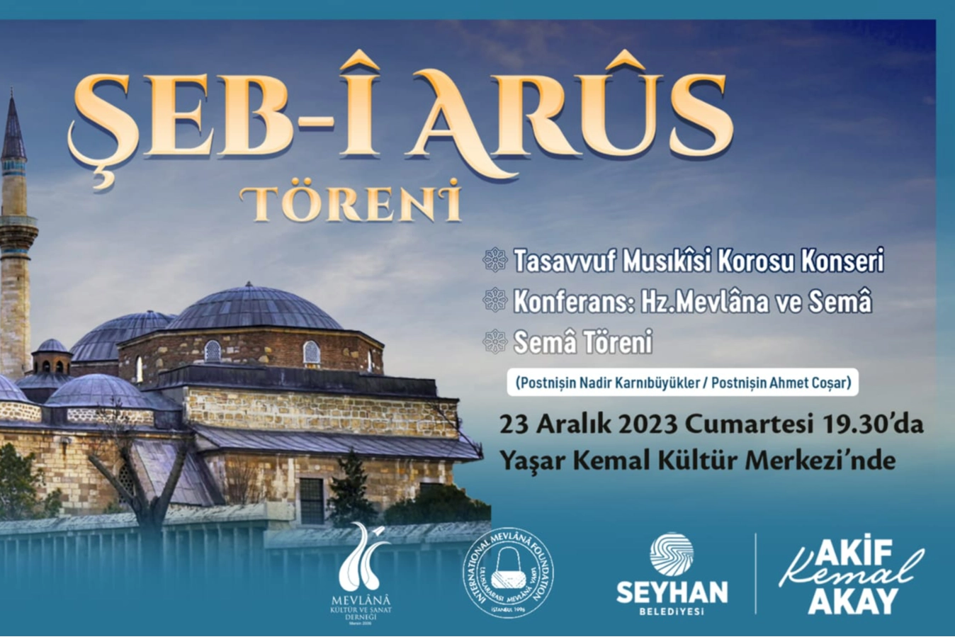 CUMARTESİ GÜNÜ, YAŞAR KEMAL KÜLTÜR MERKEZİ'NDE SAAT 19.30'DASeyhan Belediyesi, Mevlana Kültür ve Sanat Derneği ve Uluslararası Mevlana Vakfı işbirliği ile 23 Aralık Cumartesi günü saat 19.30'da Yaşar Kemal Kültür Merkezi'nde gerçekleştirilecek Şeb-i Arus etkinliği, Tasavvuf Musikisi Korosu konseri, Uluslararası Mevlana Vakfı Başkan Yardımcısı Esir Çelebi Bayru'nun "Mz.Mevlana ve Semâ" konulu konferansı ve Semâ töreni ile renklenecek.