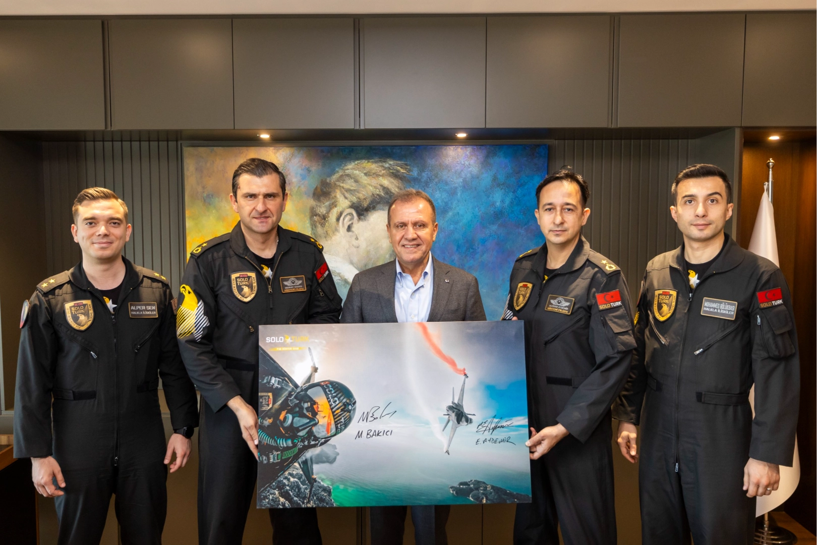 "Milli duyguları ortaya çıkarmak gurur verici"SOLOTÜRK ekibi, Başkan Seçer'e imzaladıkları SOLOTÜRK tablosunu hediye ederken, Başkan Seçer de ekibe Pegasus tablosu hediye etti. Hava Pilot Binbaşı Bakıcı, tabloyu SOLOTÜRK Müzesi'nde sergileyeceklerini ifade etti.