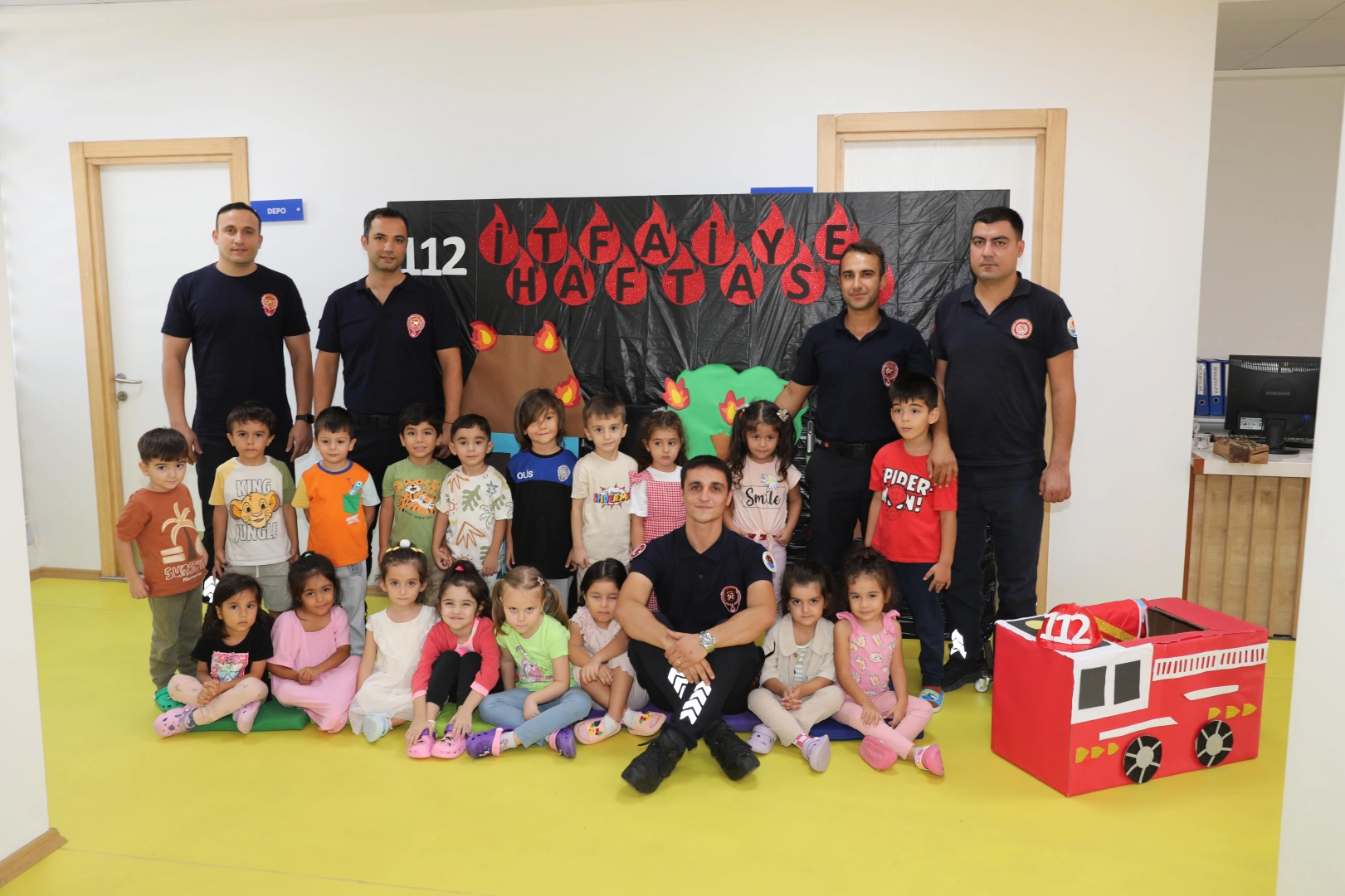 Meraklı gözlerle yangın eğitimini takip eden minikler, etkinliğin sonunda itfaiye personeliyle birlikte hatıra fotoğrafı çektirerek unutulmaz bir anı yaşadı.