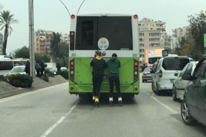 Adana’da patenli iki gencin otobüsün arkasına asılarak yolculuk yapması dikkat çekti.