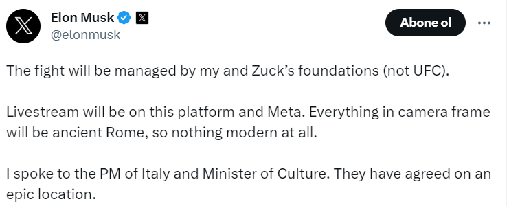 Cuma günü X'te bir paylaşım yapan Bay Musk şunları söyledi: "Dövüş benim ve Zuck'ın vakıfları tarafından yönetilecek (UFC değil). Canlı yayın bu platformda ve Meta'da olacak. Kamera çerçevesindeki her şey antik Roma olacak, yani hiç modern bir şey olmayacak. İtalya Başbakanı ve Kültür Bakanı ile konuştum. Destansı bir yer üzerinde anlaştılar." dedi.