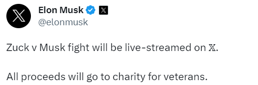 (İLKHABER) - Musk'ın bu sabah erken saatlerde attığı bir tweet'e göre, Elon Musk ve Meta CEO'su Mark Zuckerberg'in kafes maçı, Musk'ın şu anda X olarak yeniden markalaşan Twitter'ında canlı yayınlanacak. Musk, gelirin gaziler için hayır kurumlarına gideceğini söyledi. Geçtiğimiz günlerde Mark Zuckerberg, Elon Musk ile kavgasının gerçekleşme ihtimalinin düşük olduğunu söylemişti ve şimdi de ise konu ile ilgili bir açıklama yapmadı.