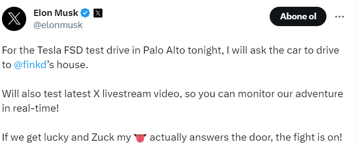 Ve ekledi: "Bu gece Palo Alto'daki Tesla FSD test sürüşü için arabadan @finkd'nin evine gitmesini isteyeceğim.