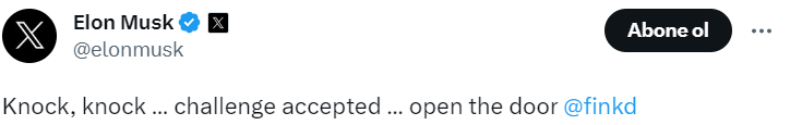 Musk Pazartesi günü attığı tweette "Tak, tak... meydan okuma kabul edildi... kapıyı aç @finkd," dedi.