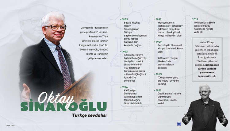 Türk kimya mühendisi, bilim insanı ve Türkçe savunucusu Prof. Dr. Oktay Sinanoğlu, vefatının üzerinden 10 yıl geçmesine rağmen unutulmadı. "Türk Einstein" olarak anılan Sinanoğlu, bilim dünyasına önemli katkılarda bulunmuş ve Türkçenin korunmasına dair güçlü görüşleriyle hafızalarda yer etmiştir.