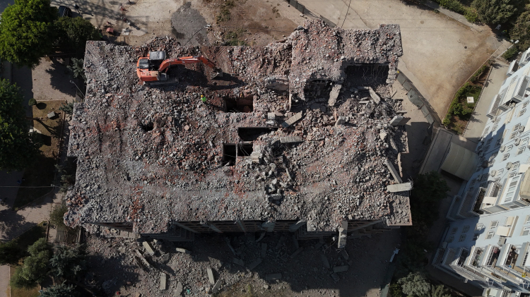 Adana’da 33 yıllık metruk bina, damına iş makinesi çıkartılarak yıkılıyor