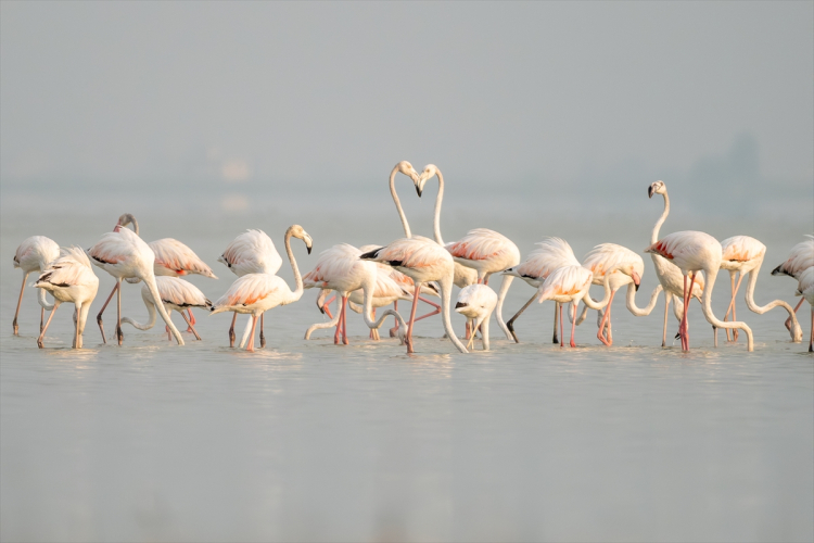 Göç yolculukları sırasında Adana’daki Akyatan Lagünü’nde konaklayan flamingolar, sabahın erken saatlerinde su yüzeyinde süzülerek beslenirken ve toplu halde hareket ederken görüntülendi. Doğaseverler ve kuş gözlemcileri, flamingoların zarif duruşu ve eşsiz danslarını kayıt altına aldı.