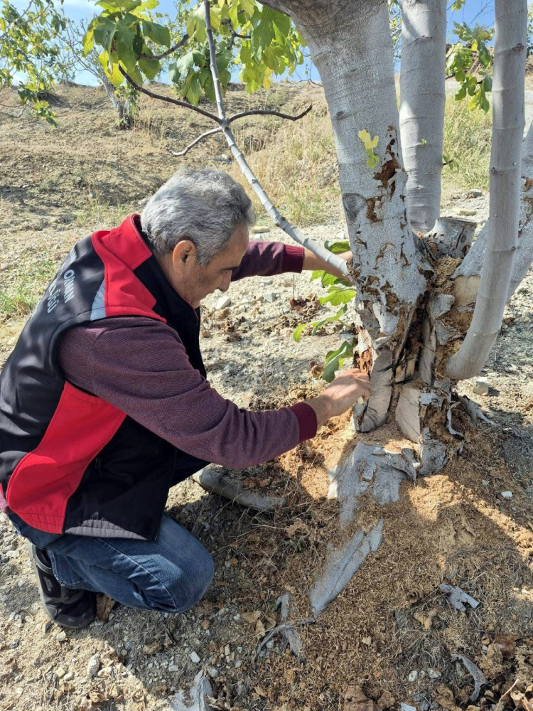 Adana İl Tarım Müdürlüğü ekipleri, incir ağaçlarını tehdit eden İncir Teke Böceği’ne karşı üreticileri sahada bilgilendiriyor. Ekipler, böceğin ağaç gövdelerinde galeriler açarak kuruma ve devrilmeye yol açtığını belirterek, üreticilere alınabilecek önlemleri uygulamalı olarak gösteriyor.