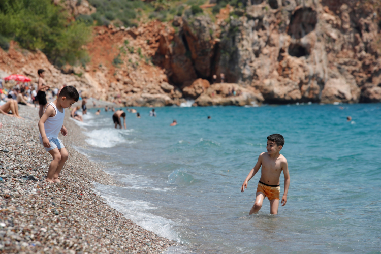 Antalya'nın Konyaaltı Sahili, Nisan ayının son haftasında güneşli ve sıcak havayı fırsat bilen yerli ve yabancı turistlerle doldu taşarken, çocuklar serin suların tadını çıkardı.