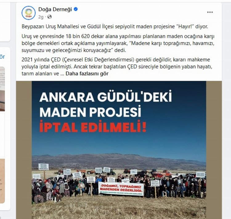 Doğa Derneği, Ankara’nın Beypazarı İlçesi Uruş Mahallesi yakınındaki 18 bin 620 dekar alanda MYB Madencilik A.Ş. tarafından açılmak istenen maden ocağı projesinin iptal edilmesini talep etti.,