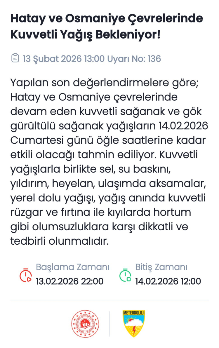 Meteoroloji, Hatay ve Osmaniye çevrelerinde kuvvetli sağanak ve gök gürültülü sağanak yağış beklendiğini duyurdu. Yağışların 14 Şubat Cumartesi öğle saatlerine kadar etkili olacağı bildirildi.