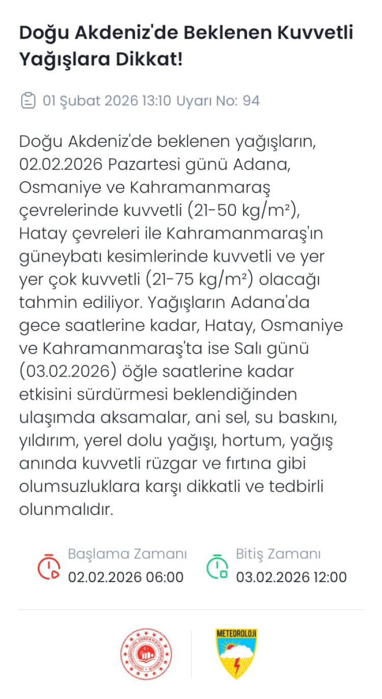Meteoroloji 6. Bölge Müdürlüğü, 2 Şubat Pazartesi günü Adana genelinde etkili olacak gök gürültülü sağanak yağışlara karşı vatandaşları sel, su baskını ve ulaşım aksaklıklarına karşı uyardı.