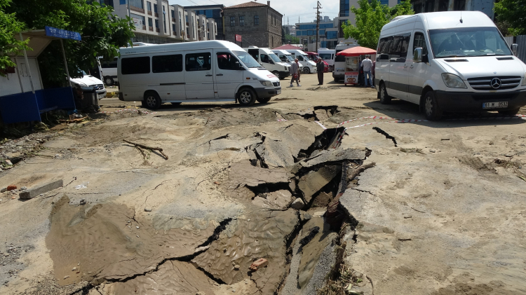 Trabzon’un Ortahisar ilçesinde etkili olan sağanak yağış sonrası Pazarkapı Mahallesi'ndeki minibüs duraklarının bulunduğu alanda beton zemin yarıldı. Selin sürüklediği ağaç kütüklerinin kanalizasyonu tıkadığı bölgede sürücüler araçlarını son anda kurtardı.